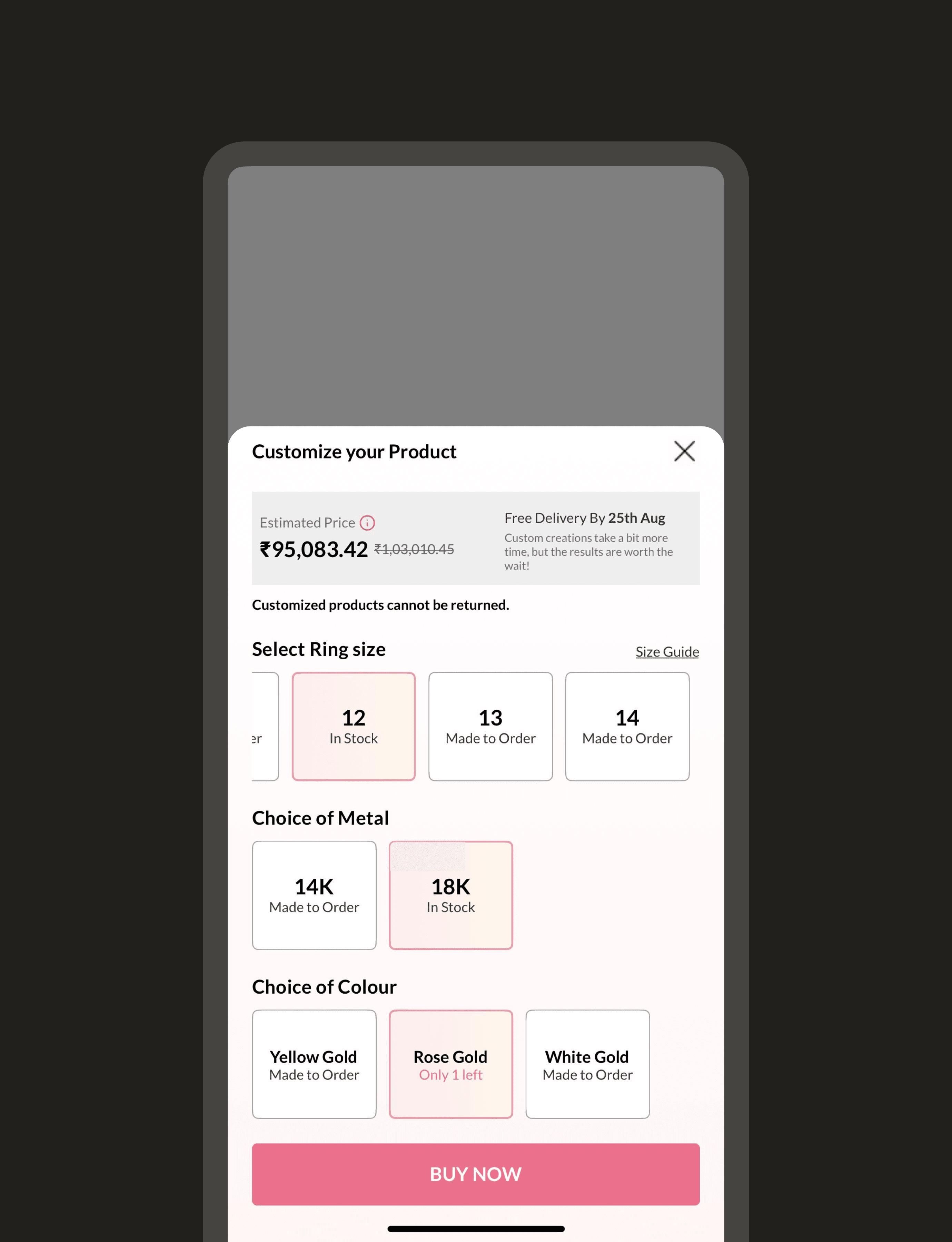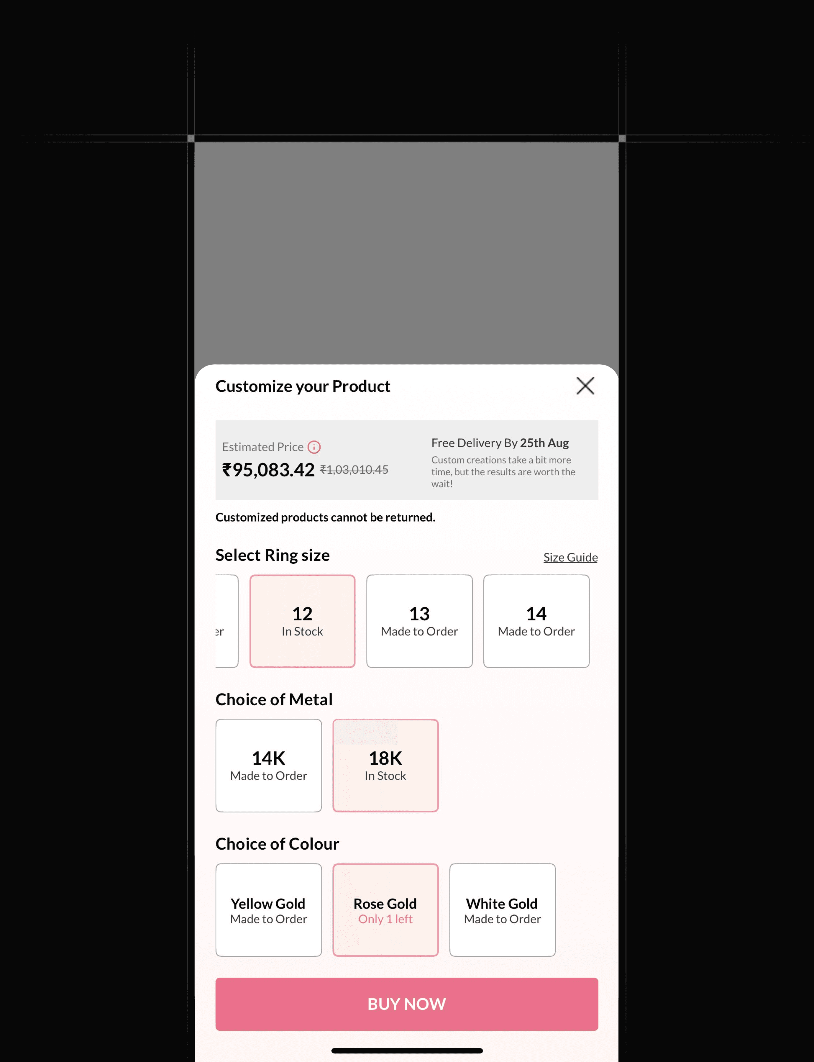Plating options now sit in the first fold and open in a clean inline pop-up. A simple one-liner clarifies what plating means, and clear price differences help users compare easily.